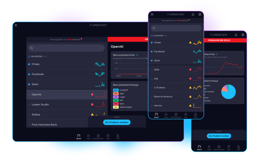 Beobachten und melden Sie in Echtzeit Probleme mit Ihren bevorzugten Diensten mittels Downdetector, der weltweit beliebtesten Plattform für das Verfolgen von Ausfällen und Verbindungsproblemen.